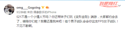 今日知名电竞主播小苍发微博声称女生也能玩好FPS,时隔5年组建了一支女子战队,但这次却是一支FPS战队,并将于5月21日直播接受男性玩家的挑战。而与小苍一直被默认为CP的大哥gogoing却第一时间代表做出挑战。有人爆料称大哥此举实则为了借521情人节之势向小苍表白。早前,小苍就有明确的“暗示”,但是大哥一直没有实际的行动去夺得美人芳心。