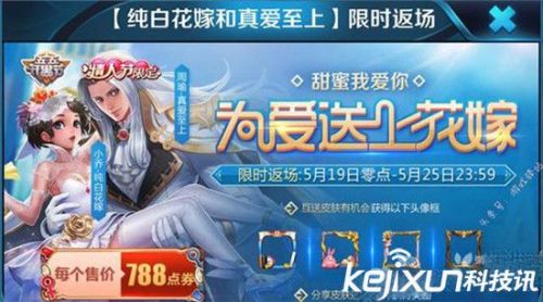 5月19日消息,王者荣耀限定皮肤返场活动5月19日正式开启,此次返场皮肤为小乔的纯白花嫁和周瑜的真爱至上,这两款作为限定皮肤可是非常珍贵的,目前这两个皮肤每个售价都是799点券,并且互送皮肤还有机会获得头像框,分享皮肤有钻石和铭文碎片拿。