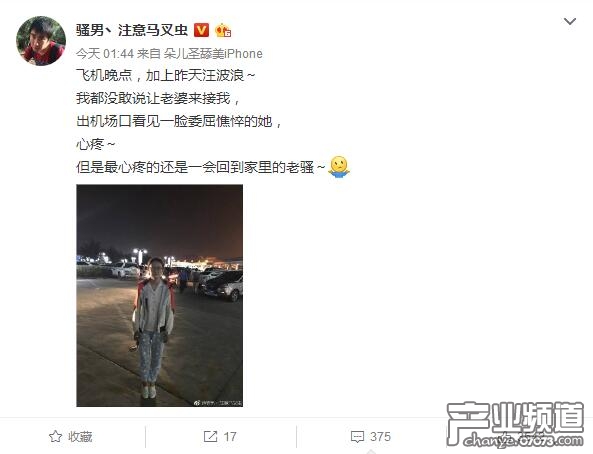 骚男前几天刚刚录完节目,在昨天坐飞机回家,老婆七七到机场接她。骚男感慨到:“飞机晚点,加上昨天汪波浪。我都没敢说让老婆来接我,出机场口看见一脸委屈憔悴的她,心疼。但最心疼的还是一会回家的老骚。”害得大家又干了一碗狗粮。