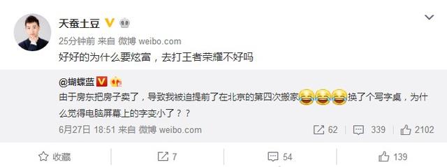 前段时间天蚕土豆与LOL解说伊芙蕾雅的婚讯让网友大跌眼镜,都以为拖豆要进入电竞圈了。不过这位LOL钻石大神似乎并没有这个打算,而是沉迷到了王者荣耀里面。近日《全职高手》作者蝴蝶蓝发文称又要搬家,却被天蚕土豆吐槽炫富,还让她来玩王者荣耀。