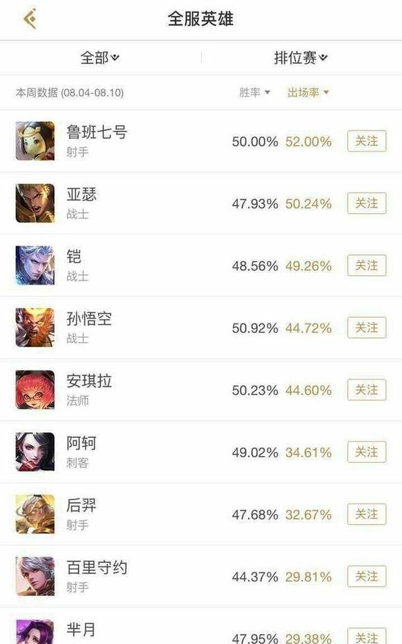本周铠的周榜第一被智障二百五给占领了,下降至第三名,而安琪拉由于增强之后上场率有增长的趋势,值得一说的是,百里守约刚刚推出就在排位出场率上跃居第八,未来还会有所浮动,虽然目前胜率较低,不过毕竟新英雄,小编还是比较看好百里守约的排名。此外,本周变动比较大的黄忠出场率剧降,可能是由于百里守约的出场以及安琪拉的加强,让黄忠不太好受吧!