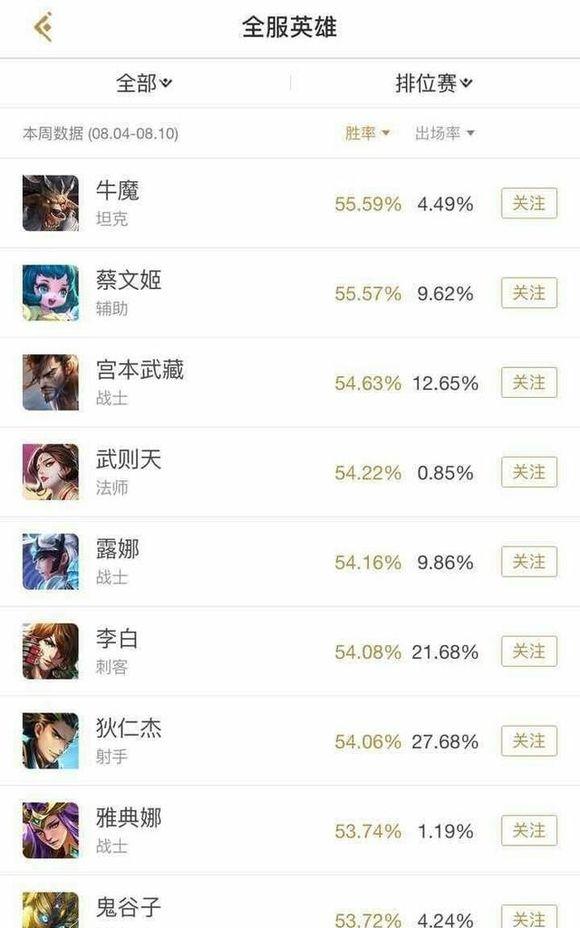 本周排位胜率英雄榜第一的是牛魔,由于版本更新对于鬼谷子的削弱,鬼谷子的胜率大幅下降,已经跌至第九位,而蔡文姬稳居第二,接下来的排名与上周一样,除了鬼谷子,英雄榜上没有任何变化,最后第十位的高渐离胜率已经跌至51%,近期成吉思汗则是挤入前十,看来哈士奇又要火了。