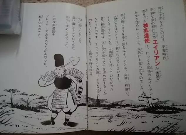 平安京是日本京都在平安时代的旧称,玩家需要扮演一名“检非违使”,将巨大的异形生物驱出城市。所谓检非违使,是指检查非法行为的天皇使者,负责维护京都的治安民政。不过他对付异形生物的武器并非武士所持的太刀,而是一把铁锹。在GB版《平安京异形》的游戏说明手册上,我们可以看到主人公手持铁锹的勇武形象。