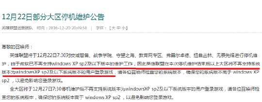 “由于微软已不再支持windows XP sp2及以下版本的维护工作,因此英雄联盟在本次停机维护结束后以上大区将不再支持系统版本为windowsXP sp2及以下系统版本的用户登录游戏,请各位召唤师检查您的系统版本,确保您的系统版本高于 windows XP sp2 ,以避免影响您登录游戏。”