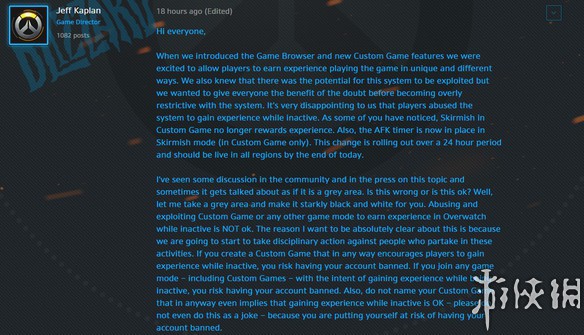 在社区蓝贴中,游戏中间Jeff Kaplan表示,游戏引入自定义模式的本意是允许玩家能够获得不同的游戏体验,同时可以获得经验。最开始的时候也知道系统可能会被滥用,但是实际情况还是非常失望。所以现在自定义游戏中的突击模式不再获得经验奖励。而且自定义突击模式中还加入了挂机被踢出的计时器。这会在24小时内在所有地区的服务器上线。