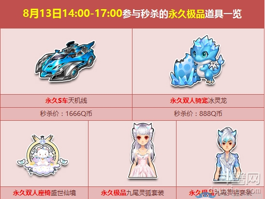 活动时间:8月13日(本周六)14:00-17:00,活动内容:QQ飞车贺[掌上飞车]用户突破百万!大家梦寐以求的永久S车[天机线]永久双人骑宠[冰灵龙]永久双人座椅[盛世仙境]、永久极品套装[九尾灵狐套装]低价限时秒杀,数量有限!手快有手慢无哦!