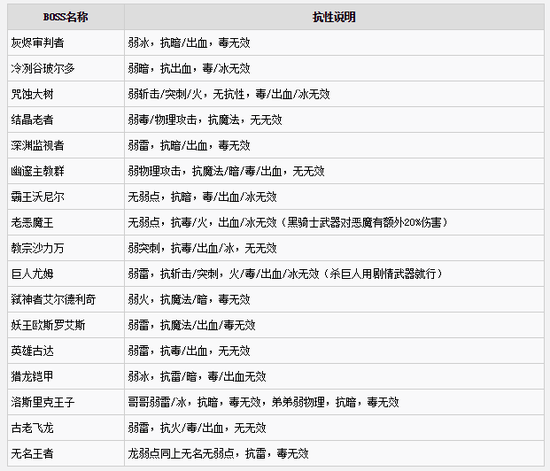 《黑暗之魂3》游戏中玩家可以针对各BOSS的抗性来附魔、更换武器,当然大家可能对其弱点不太了解,下面小编带来“zzx512499450”分享的《黑暗之魂3》全BOSS抗性及弱点列表一览,希望大家喜欢。