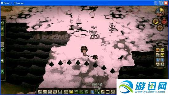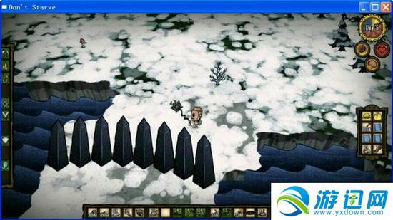 可以选择四样东西进入下一关,推荐选择步行手杖(有必选,无下一个,有必选,无下一个),食物(有必选,无下一个),猪皮(和草配合制作猪皮头盔,女汉子随意),树枝(第四关去永夜必带,可以不带草)。