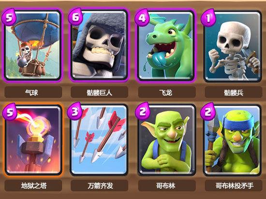 气球:核心卡,最少2级,配合骷髅飞龙打combo或单偷一路都很好,徐涛放在飞龙和骷髅的后面,沿最边放很可能不会被黄金位的塔勾引到。