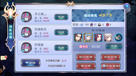 多样的职业系统和阵法搭配,精美的装备和酷炫的技能,还有3D战斗画面当中角色变身以及神器的降临,这样的游戏岂能少了玩家和玩家之间的相互‘厮杀’。进入pvp系统,我们可以看到,系统会随机给你安排3个排名比你高的玩家,每天都5次挑战机会,用完之后可以用钻石刷新次数和玩家,右侧则是你自己的服务器排名以及阵容和战斗力。