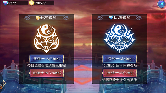 首先说一下英雄的获取,英雄获取只能通过直接召唤或者碎片的合成。召唤分为2种,有金币召唤和钻石召唤,可以召唤1次,也可以召唤10次,其中免费召唤存在CD时间,而钻石10次召唤则100%会出现英雄。如果召唤出的英雄玩家已经拥有,则会自动转化成该英雄的碎片,可以用于英雄的升阶。