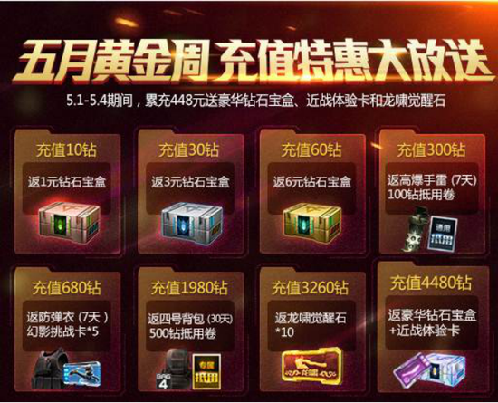 CF正版FPS手游《穿越火线:枪战王者》全新版本《武器大师》在4月28日已全面上线,更新即领200钻、龙啸觉醒石和灵狐者(3天)!并在5月1日-5月4日期间,玩家在CF手游进行充值,还可获得返还比例,并且充的越多越有超值大礼包赠送,精彩不容错过。钻石宝盒、高爆手雷、钻石抵用券、幻影挑战卡、防弹衣、龙啸觉醒石、近战体验卡等极品道具都将在充值回馈中一一送出,希望玩家不要错过。