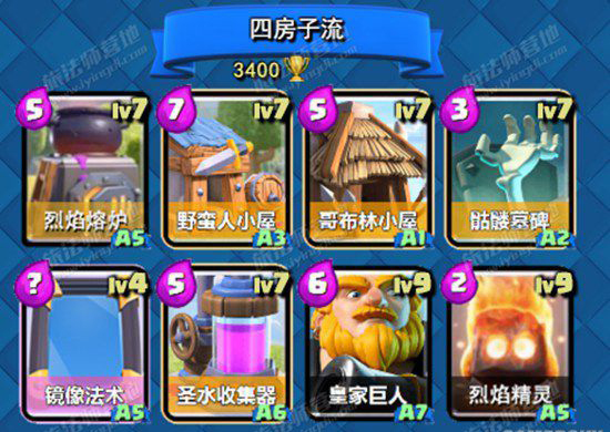 这个卡组的具体玩法跟高费的巨人房子近似,前期根据对手卡组放对应的房子,墓碑可以随时作为试探放出去,而黄毛房子则用于抵挡对手强攻卡组,熔炉可以抵挡空中单位比较多的对手,最后哥布林房子则是什么时候都要准备的。