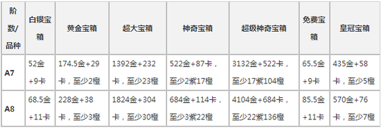 新版本中,不考虑时间成本,A7/A8秒战斗宝箱的性价比都远远高于任何商店宝箱,尤其是A8的战斗宝箱在紫卡的数量上都已经逼近了超级神奇宝箱。正常玩家的氪金思路应该是:保证购买每一张2000G的商店紫卡,宝石用来秒宝箱保证每场胜利都可以获得宝箱,实在没时间打对战或者急需提升的话才考虑开超级神奇宝箱。