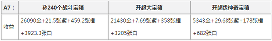 通过上面的表格可以看出,当到达A8之后,秒战斗宝箱的性价比已经超越了超神宝箱!