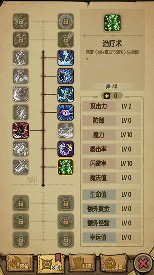 “治疗术”,回复(60+魔力*350%)生命值。10000魔力时,回复血量为35060。消耗40点魔法值施放一个“治疗术”,人物立即满血。