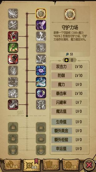 “守护力场”,获得一个可吸收(300+魔力*400%)伤害的守护力场,守护力场存在期间,魔力增加50%。10000魔力值时,可吸收的伤害为40300。守护力场存在期间,魔力值增加到15000,此时的治疗术回复为52500,魔法吸取输出魔法伤害为18750,能量爆裂造成魔法伤害值为37500。