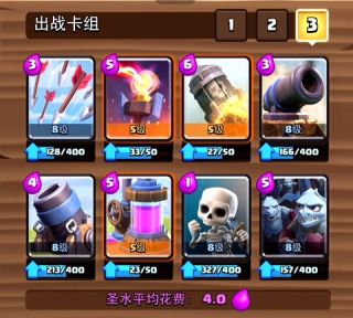 用上图卡组做一讲解,我起手的四张分别是收集器,箭雨,小骷髅,加农炮。可视下张(第五张)是迫击炮。