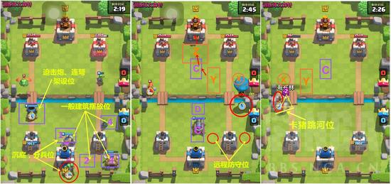 Ps:值得注意的是,假如你在C、D位置放置了防御塔,那么你的远程防守单位最好放置在公主塔的另一侧,也就是贴近地图边缘,公主塔的斜前方放置。这也是有效避免对面法术,尤其是火球、冰冻一波全解的有效方法。