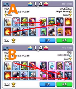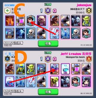 B场:箭雨优先解公主,这也是必须的。因为跟在皮卡背后的公主会是我用骷髅兵和哥布林遛狗大皮卡时,最大的威胁!因为必须要留着箭雨给公主,所以火球就要给亡灵群,效果和A场类似。地狱塔解皮卡这也是常识,看到双王子过来时,地狱塔能不交就别交,灵活运用加农炮和小兵。