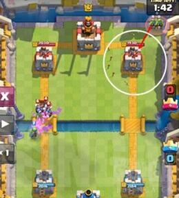 现在流行一套骗箭雨的套路,骷髅巨人带着公主(骷髅海)、亡灵群和飞桶。这套多以飞桶为主要输出,那么飞桶的使用时机就显得十分重要了。首先,你在比赛开始为掌握对方手牌时,不要轻易交出你的飞桶。其次,对手交出箭雨等法术、且你骷髅巨人过河刚吸引到公主塔伤害时,就是你一发飞桶的最好时机。最后,如果你不是这样的套路,那么你的飞桶在对手两次有电击或者箭雨秒解你的飞桶后,将其作心机桶,丢在屏幕上方两个角落的位置,如下图所示。
