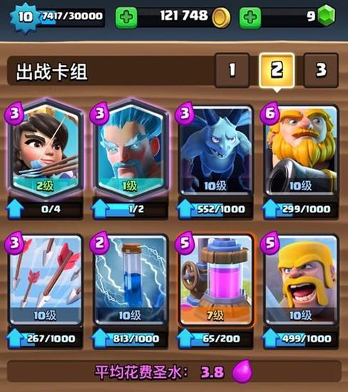 这是我现在用的卡组,记得当时天梯前十有三位大神都是这套,一模一样的八张,于是怒截图,这周终于买到了冰法,终于组了起来。不得不说,公主和冰法真的OP,防守端实在是太强了,走得慢适合过牌,打起来也怪强,讲道理应该削弱。我直到参加CI的线下赛之前都没有用过公主和冰法,比赛中用过之后就觉得没有传奇卡不会玩了。。。无论是冰法还是公主配合小闪电都可以瞬秒苍蝇群,这就是我觉得现版本起码A8苍蝇群不强的原因,商店能买传奇之后几乎人手双传奇,苍蝇群贼难生存。另外一点是这套没有带加农炮,我觉得非常有道理,不仅仅是新版本加农炮再次削弱的原因,更是加农炮与赚费反打的思路不符。野猪和皇家巨人在什么情况下才能凭一己之力打掉你的费用?只有你拍加农炮的时候。如果是用黄毛解,你是一点费都不会亏的,解完直接拍皇家巨人反打,这才是符合我的思路。不带加农炮的确会掉更多血,但是反打的力度更强,我觉得是值得的,毕竟如之前所说,皇家巨人在打成1:1后很强,互换一塔是我可以接受的。我是这周开出的冰法,还没认真冲分,每天打打宝箱胜率很高,现在3400+,等我赛季末再来更新感受。