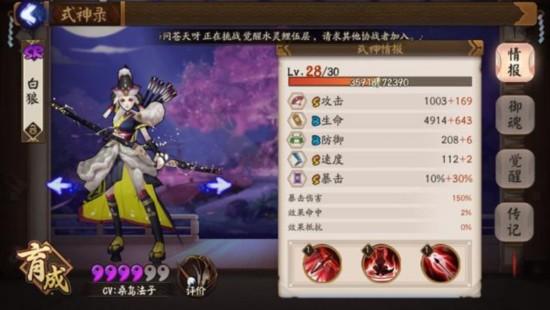 被动:回合结束是有30%概率提升下回合20%暴击伤害。配合大招,暴击概率感人,半血秒杀就是她了。大招:3火。造成237%的伤害,并且本次攻击暴击概率提升30%,成功击杀行动条增加60%。白狼的大招暴击率也称得上是前无古人后无来者了,自带额外30%加成,加上白狼面板10%暴击,御魂的15%到30%的暴击加成,如果这都没暴击,兄弟你可以去买彩票了。