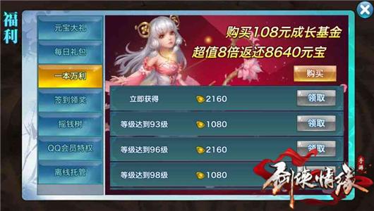 随着90等级上限的开放,游戏还开放了一本万利叁的购买,达到90级且一本万利贰已领完的少侠就可以充值购买。少侠购买后即可享受8倍返还,除却立即获得的元宝外,还可在等级达到93级、96级、98级、100级时领取相应的元宝,可谓是福利满满。