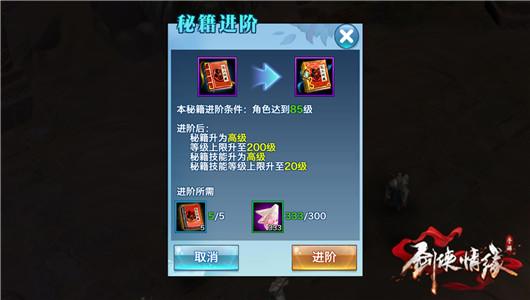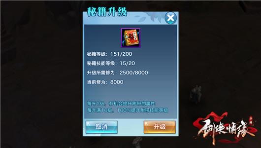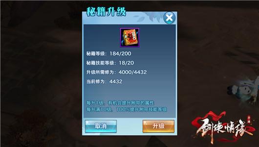 进阶要求当秘籍进阶为高级后,其等级上限变为200级。各位少侠就需要通过提升秘籍等级来实现战力的飞跃。秘籍升级只需要修为值,但需求量惊人。比如从150到160每级需要2500修为值,从160到170每级需要3000修为值,从170到180每级需要3500修为值,从180到190每级需要4000修为值,从190到200每级需要4500修为值。所幸修为值除了通过在线时间积累,还可以通过家族珍宝坊兑换或通过拍卖、摆摊等方式获取。