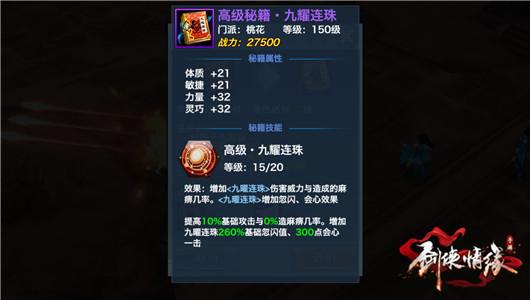 4、高级秘籍·九耀连珠。效果:增加九耀连珠伤害威力与造成的麻痹几率。九耀连珠增加会心和忽闪效果。