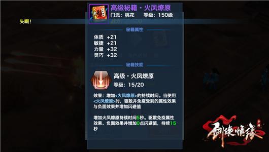 3、高级秘籍·火凤燎原。效果:增加火凤燎原的持续时间。当使用火凤燎原时,驱散并免疫受到的属性效果与负面效果并增加闪避值。