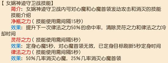 1、进入女娲神迹守卫战地图内,使用界面右下角“三个技能”消灭心魔和心魔首领,保卫神迹守卫。