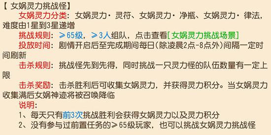 流程:剧情开启后至完成期间每日(凌晨2点-8点除外)在不同地图上挑战“女娲灵气挑战怪”胜利后将收集女娲灵力。当三种女娲灵力都达到5000时,进入下个阶段地图开启仪式。