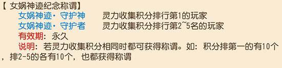 2、挑战可获得灵气积分,灵力积分前5的玩家在女娲神迹开放后可获得永久称谓奖励。