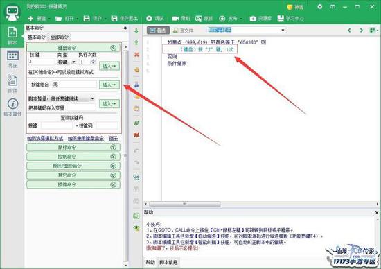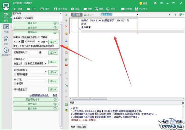 5、关闭抓抓功能,在按键精灵主界面的基本按键命令中的控制命令选择你刚才抓取的坐标和颜色,点击插入,即在右边的程序显示框出现了一段判断文字,如图所示: