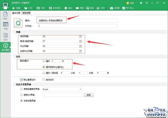 8、然后在脚本属性选项中,设置好你所完成的脚本名字,各种快捷键,脚本循环选择循环到按中止键为止。