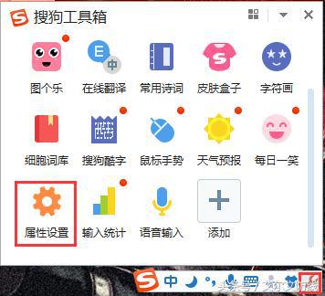 首先我们需要点击输入法右边的小扳手位置,然后选择属性设置。某些使用了皮肤的同学可能显示不一致,但是方法一样,找到小扳手图标就行。