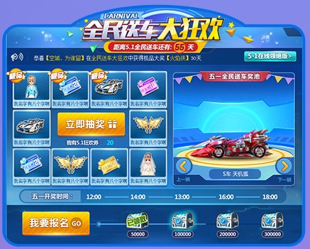 5月1日前使用5.1狂欢券每日参与抽奖即有机会获得幸运值,幸运值会提高5月1日当天获得极品奖励/永久奖励的概率哦![报名入口:游戏大厅下方“全民送车”,报名即可获得永久道具&极品羽翼!]