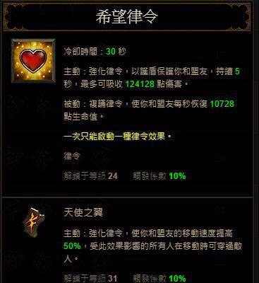 希望律令—天使之翼,这个技能团队增加50%移速,在前期,移速十分重要。配合被动律令无疆可以给团队带来持续10秒的移动速度buff,并且提供护盾。建议全程使用这个律令。