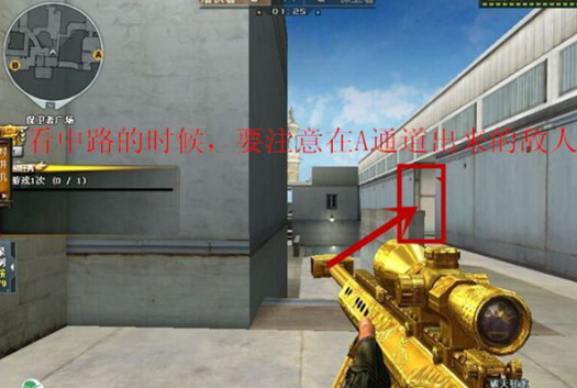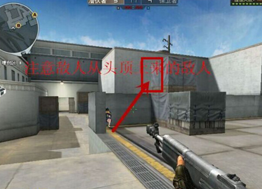 如图:“一人贴于墙,另一人站在小道口箱子上。需要注意的一个是听声音,确定敌人位置和敌人数量,第二注意不要随便闪身,小心 被组合箱处的狙击打死,第三需要注意A门进人,箱子上的尽量不要马上转头支援,因为往往伴随着小道的敌人,当然,要根据实际情况灵活决策。”