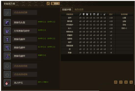 配装:黑狼鸟头、手、腰、腿+片耳黑狼鸟胸,不带护石不打珠子初始技能点是锋利度9、听觉保护9、达人9。大家可以根据自身喜好随意配技能,核心技能都有,喜欢心眼的就可以出个心眼,需要观察眼的就出个观察眼。给萌新发个带心眼的配装吧,只要+2的剑术护石就行。