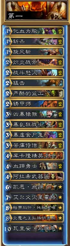 这套瓦王战和传统的中速瓦王战打法类似,值得注意的是萨满所使用的瓦王战在卡组中添加了腐化的霍格这张新卡,其表现也不错。有兴趣的玩家不妨也可以试一试这套卡组。以下是卡组详情: