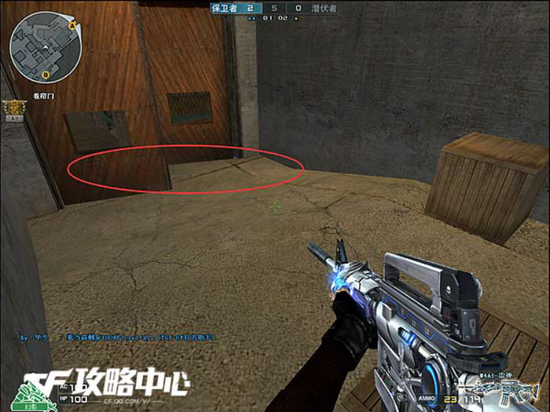 Ps:在图中所圈区域站起来的话是可以打到的,但等他反应过来你已经过去了,这个小技巧过点时是可以用的,但是最好不要直接跳下去,敌人知道你在这里后可能会直接转到A控瞄管道口,(若是整队敌人报点后A的敌人会看着管道口,你可以叫进攻A的队友先行动)你从哪里下是由你自己决定的,这是听脚步玩心机的时刻。