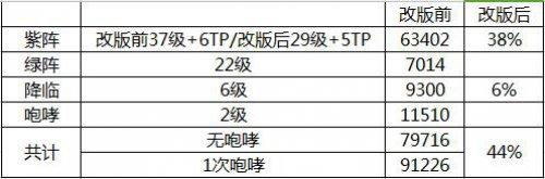 点评:同样被削弱的一个核心辅助技能,具体削弱多少后边再详细计算。以后只能点20级,且TP不再加成减防,也就是说这里可以 省下360点SP,及10点TP。另外紫阵的减速、减硬直这些属性没有提到成长增加,很有可能会被削掉这29-20=9级的数据,即紫阵的控制能力也削弱 了。