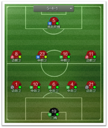 5-4-1的特点,第一,后卫数量多,占了场上人员的一半(门将不算),这就决定了可供选择的防守技能数量很多;第二,5-4-1也是一个非常适合打边路的阵型,有很多可以提供下底的,那为什么说,5-4-1可以克制352呢?因为5-4-1有多达5个防守球员,大大增加了5后卫拦截的可能。同时,在进攻端,541走的必然是边路下底传中路线,无视352盯人的影响。只需要突破中场防守,就可以直接打门。大大提升了进攻效率。