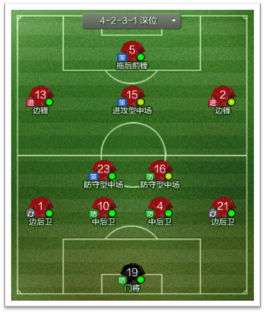 4-2-3-1深位这与4-2-3-1-ACM有极大的不同,4-2-3-1ACM是控球阵,这则是个反击阵型。这个阵型主要还是以长传球为主,拖后的组织核心要求大局观极强,视野极广,长传要求极准确,并且还要有一定的防守能力。那名防守型后腰只要求防守强就好了,没有合适人选的话可以考虑用中卫改造。两翼要求速度够快,能打对方一个措手不及,最好还是一名边锋一名内锋,前腰位置要求球员穿直塞球能力极强,并能有远射和射门能力,当中锋拉开空当或拉到边路时能充当前锋角色。单前锋要求全能,不仅要自己能够进球,还要求会为队友尤其是那名前腰做球,速度也不能太慢,还要有一定的制空能力,反正就要全能。这个阵型要求球员速度要快,反击效果要强。