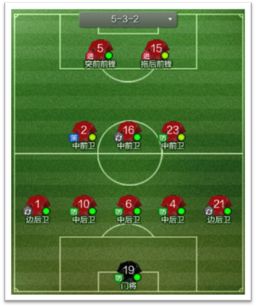 5-3-2这种阵型安排5名球员在后场,是一种比较典型的防守反击打法,常用于实力弱于对手时。该阵型反击时的攻击点在于两名前锋和及时插上的边前卫或边后卫,因此可知,前场中路和边路是该阵型快速反击的重点区域。