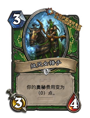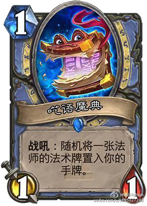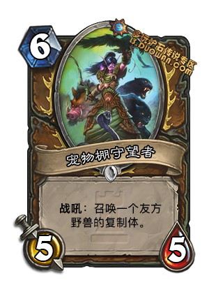这张卡我往中速猎卡组里一放, 最差的结果是招出11的驯兽师和科多. 其他好像都还不错的样子. 而且这是召唤一个11的复制, 也就是说如果他拉了一个11的狮子, 你还可以再抽两个狮子放上来. 当然这张卡的潜力不止于亡语猎卡组, 配合大帝螺丝大蓝龙等也是强无敌, 具体如何还要看进一步开发.