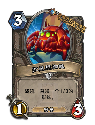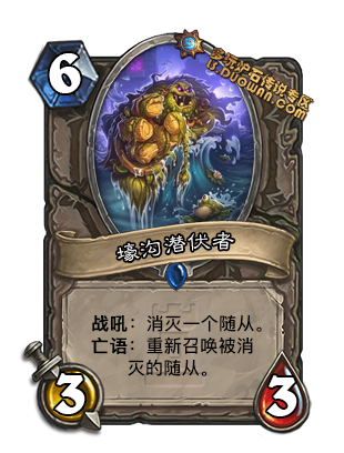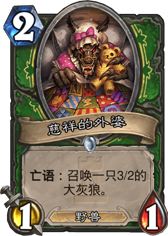 这张卡我给高分是因为他弥补了中速猎2费尴尬的问题. 以前只有蛤蟆,看牌象等尴尬选项的中速猎迎来了一个能打的2费生物, 身材不用说是超模, 同时亡语出来的32也是野兽. 说一千道一万,只要不被大地震击, 前期这张牌是很难被移除的, 因为曲线问题比433亡语更好的配合驯兽师. 当然后期空手摸鱼的时候你可能不愿意摸到他..