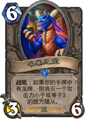 6费36身材 战吼是一个"痛"的效果, 前提是不卡没龙. 如果是控制卡组比如龙防战 应该可以带, 但完全不适合速攻龙战. 也不能说这张很弱, 小于等于3攻的随从现在还是很多的, 比如紫罗兰,鹿盔,铜须,火妖,水元素,小鬼首领,图腾魔像等等. 实用性还是有的,就是有点高费.自身高费龙属性又是针对牌,可以一直憋在手里当做龙卡组的启动器吧(悄悄告诉你们还可以消灭精灵龙).